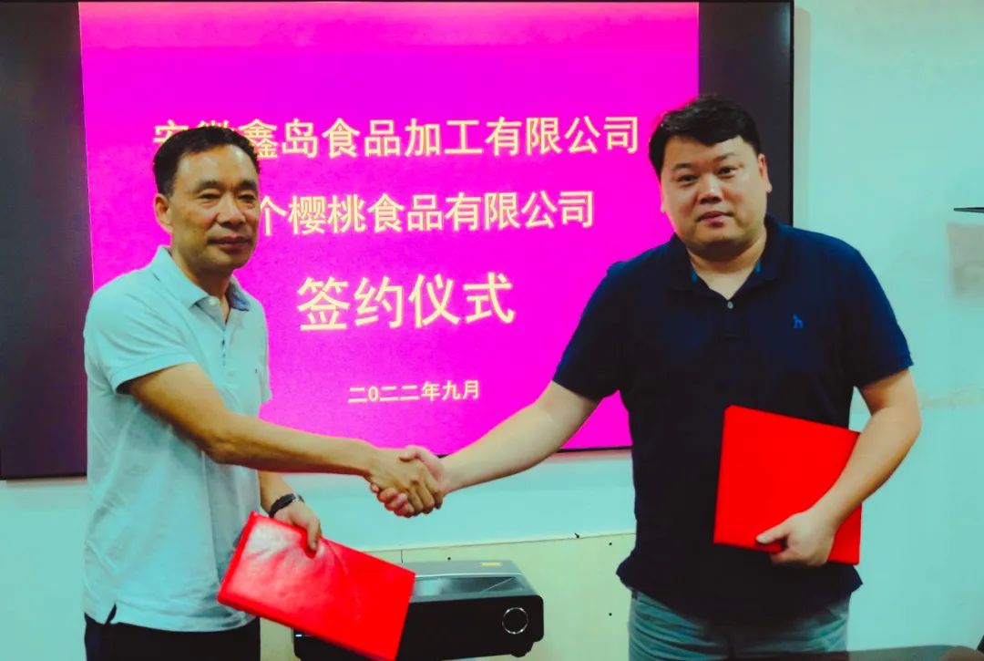 2022年09月16日下午,在匯鑫集團(tuán)一號會議室舉行了鑫島食品加工有限公司與江蘇三個(gè)櫻桃食品有限公司戰(zhàn)略合作協(xié)議的簽約儀式。鑫島總經(jīng)理張青、三個(gè)櫻桃總經(jīng)理張現(xiàn)東出席簽約儀式并在協(xié)議文本上簽字。